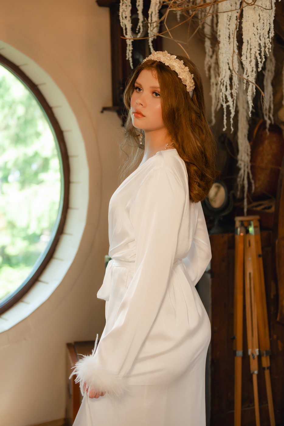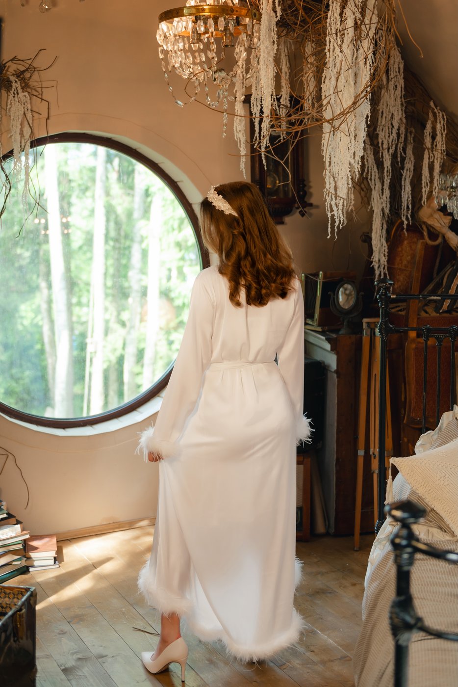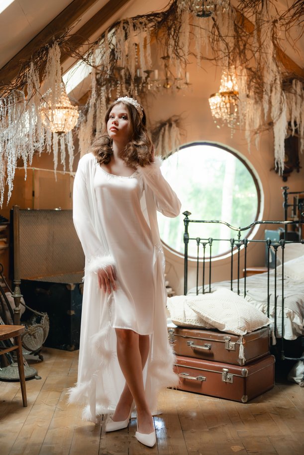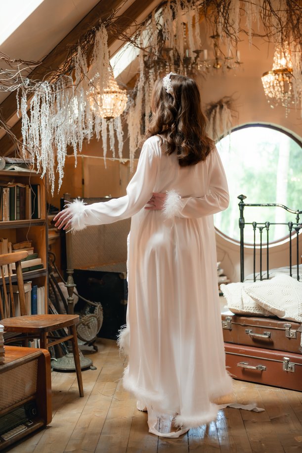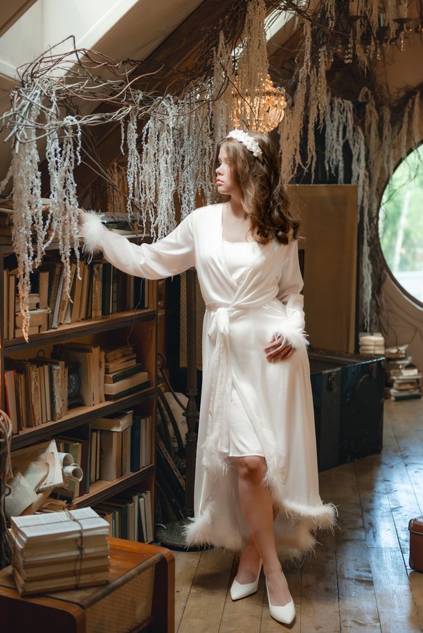 Пеньюары и комплекты с перьями - это тренд сезона, поэтому мы сделали линейку свадебных аксессуаров с перышками, так, этот длинный халат с опушкой станет модным дополнением к свадебному образу. Халат на поясе, который вшит в сам халатик, поэтому вы его не потеряете.