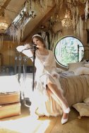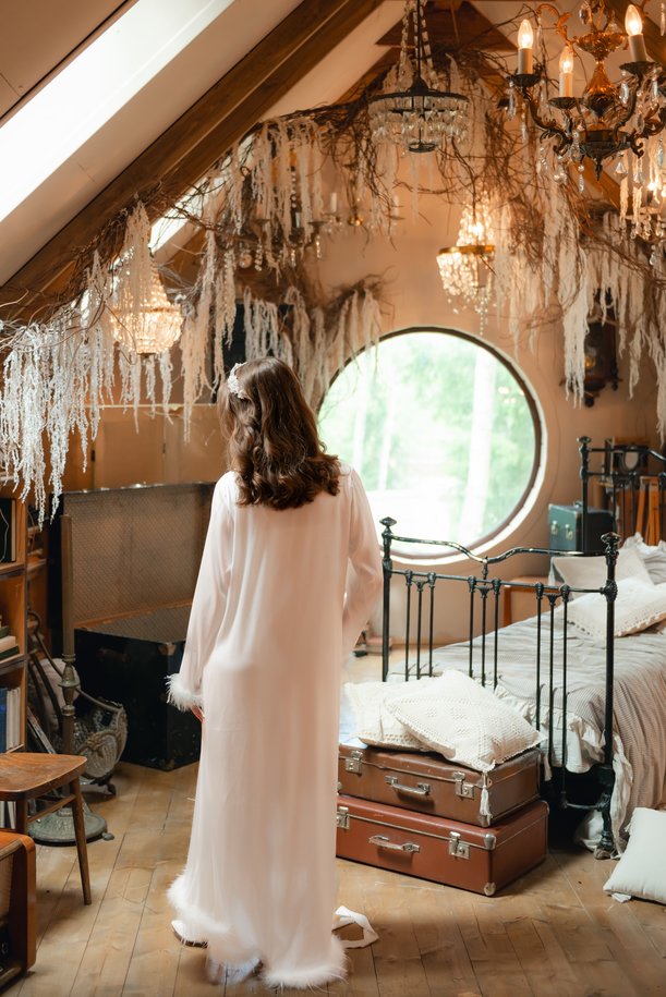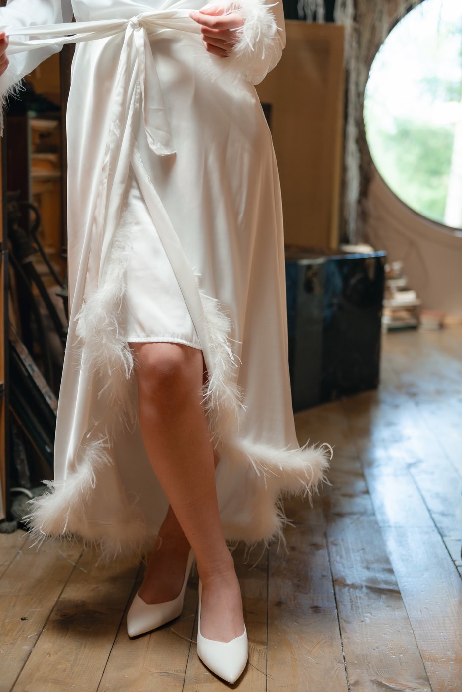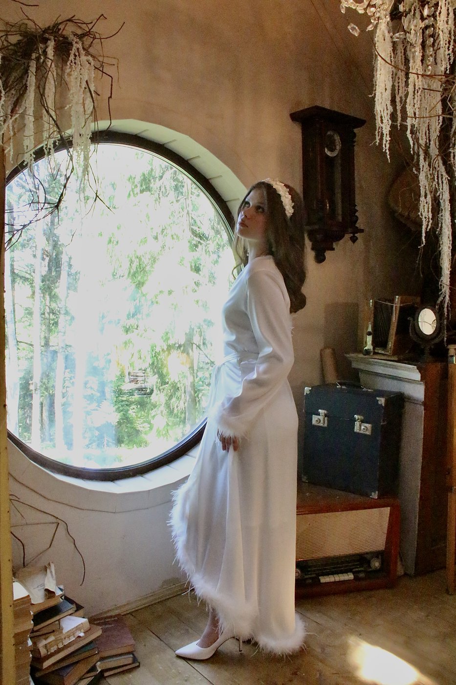 Пеньюары и комплекты с перьями - это тренд сезона, поэтому мы сделали линейку свадебных аксессуаров с перышками, так, этот длинный халат с опушкой станет модным дополнением к свадебному образу. Халат на поясе, который вшит в сам халатик, поэтому вы его не потеряете.