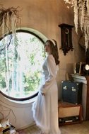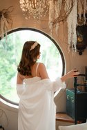 Халат длинный для сборов невесты, идет в комплекте с сорочкой длиной по колено. Сам свадебный белый халат длинный, но его длина очень универсальная и удобная: халат с перьями не до пола, халатик без шлейфа и не будет волочиться по полу. Халат примерно по щиколотку, конечно зависит от роста девушки, на нашей модели комплект - халат и сорочка размера М, рост модели 160 см.