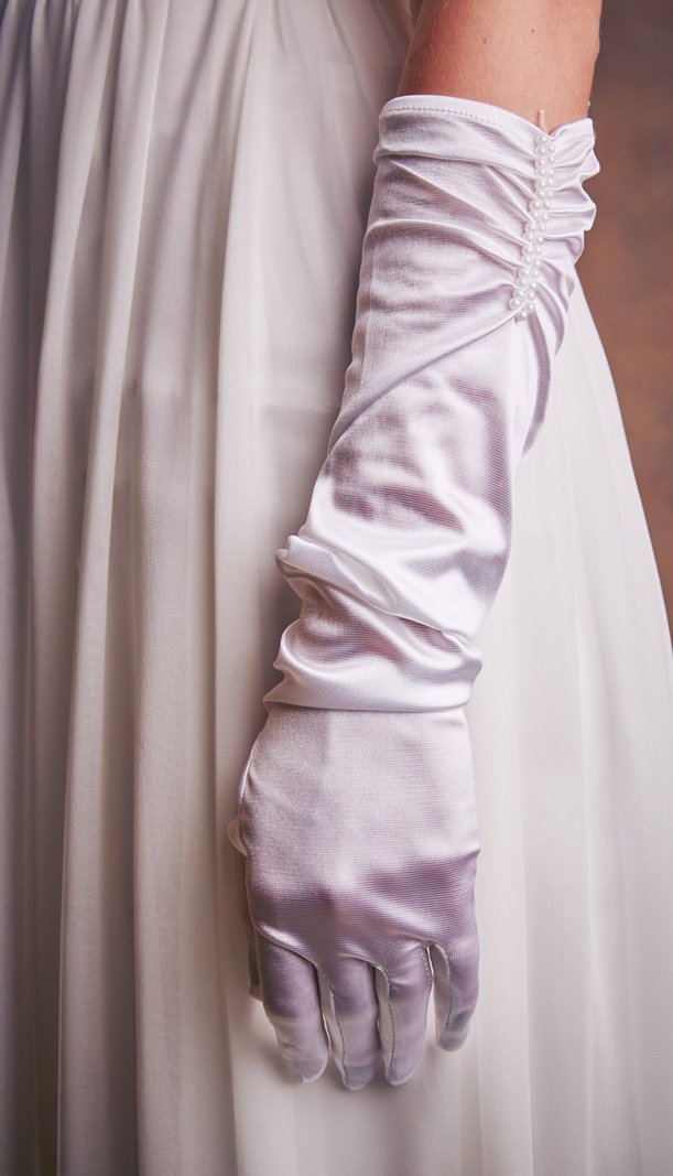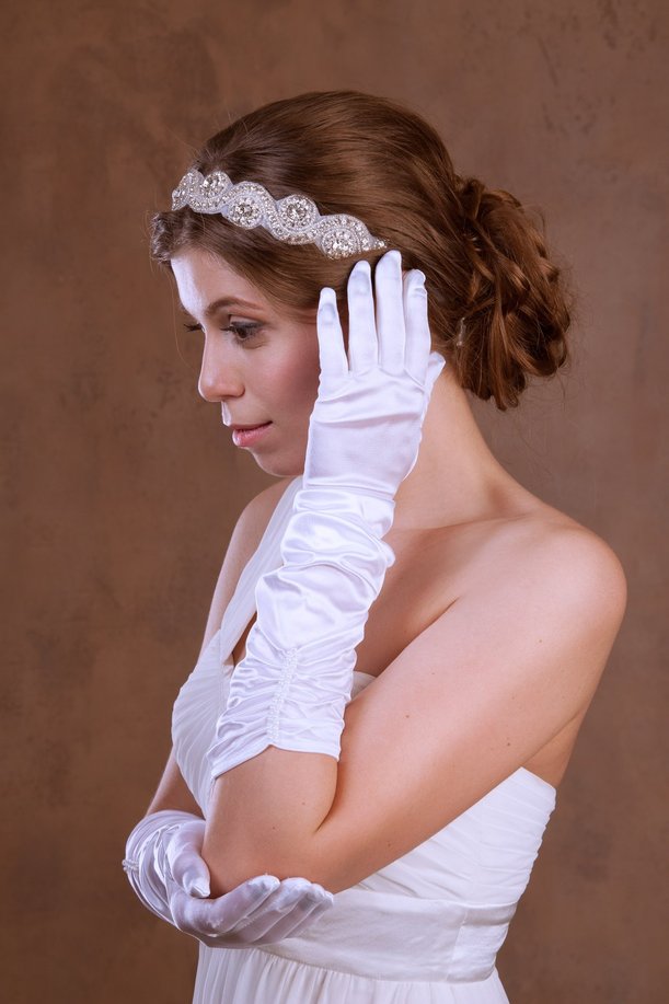 Классические гладкие свадебные перчатки с длиной за локоть из атласной ткани подойдут к платью без рукавов, а также к платью с коротким рукавом.