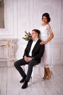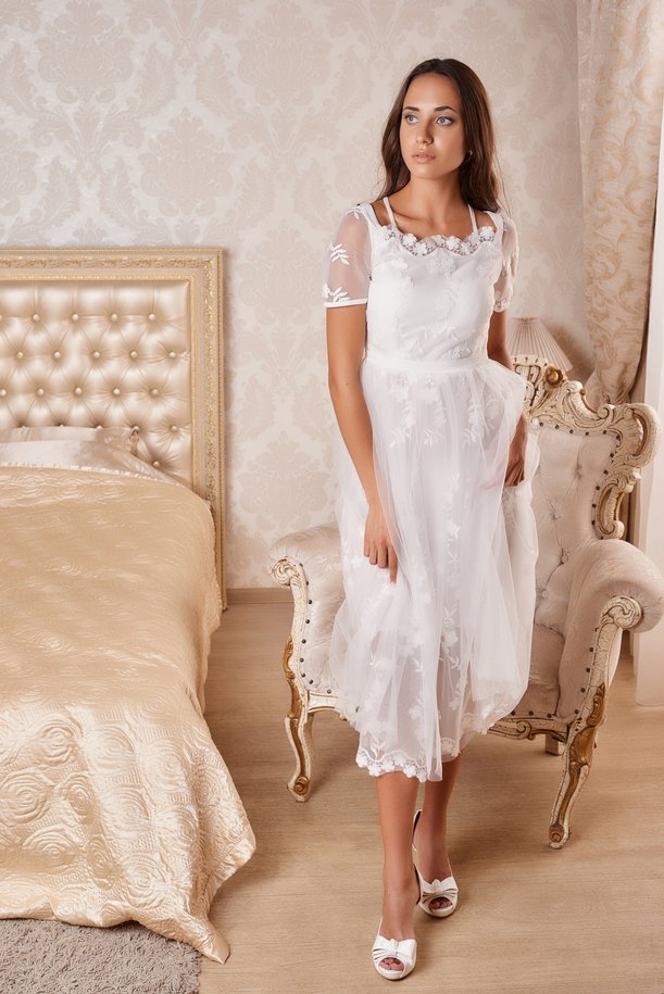 Невесомое платье с короткими рукавами, фатиновой юбкой и кружевами подойдет для утренней фотосессии или для свадьбы у моря. Легкое платье сделает образ невесты еще более светлым и нежным.