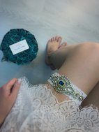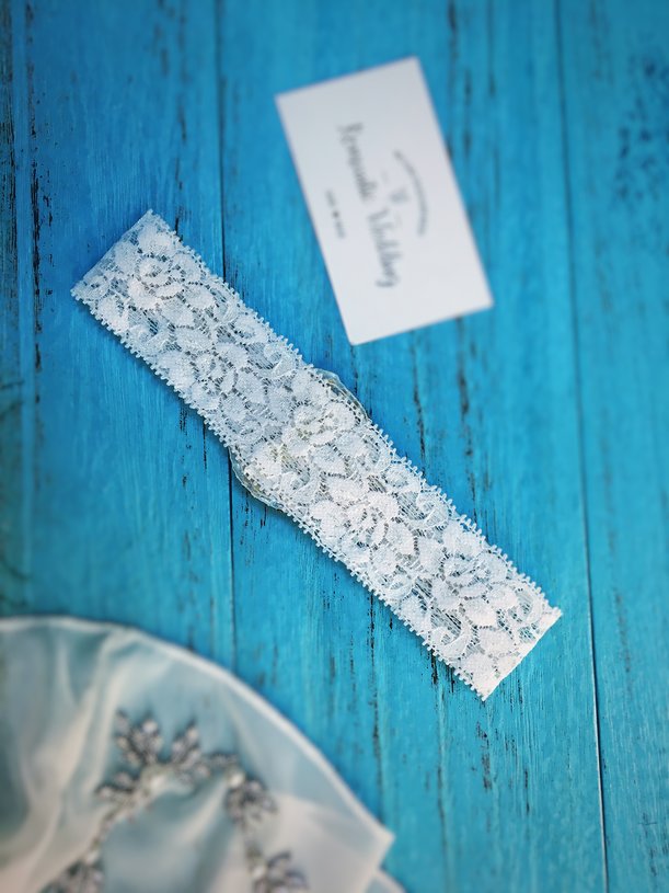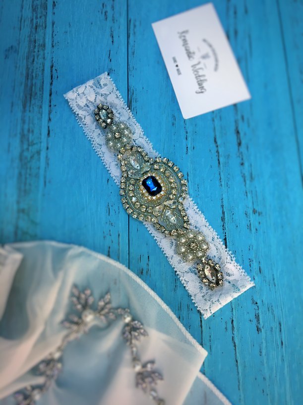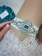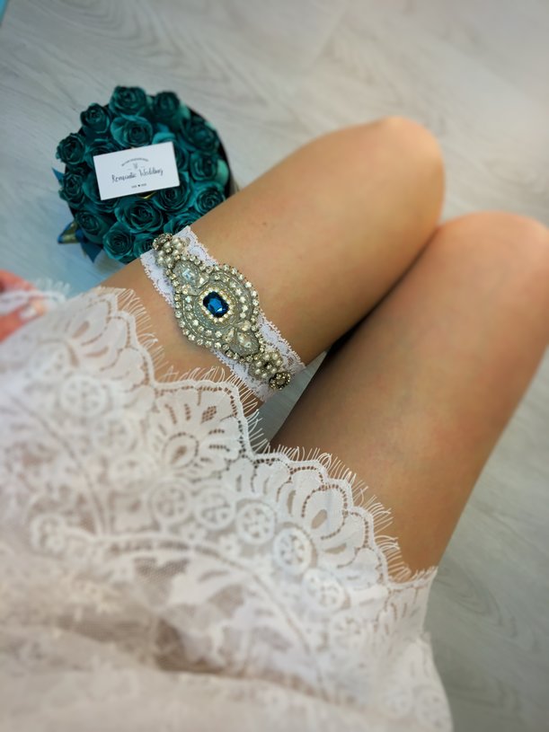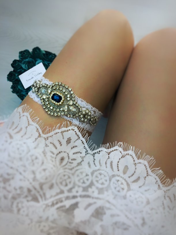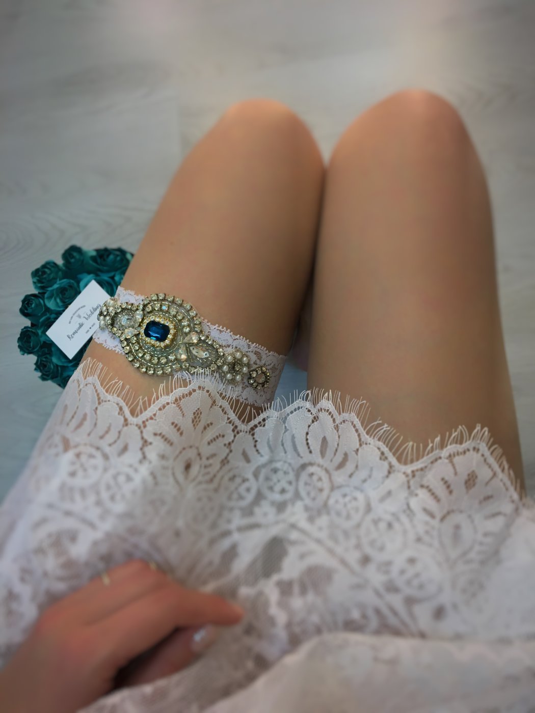 На белом кружеве крупное красивое украшение подвязки, в центре камень темно-синего цвета. Стильная подвязка для стильных невест.